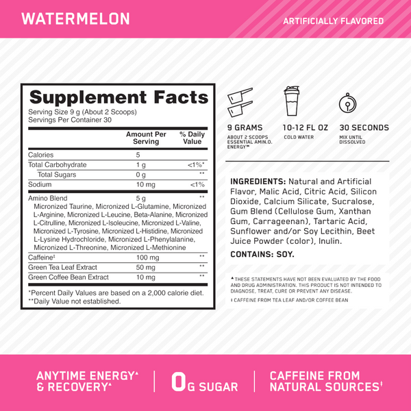 O Pré-Treino Amino Energy Watermelon 270g é a combinação perfeita de energia, foco e suporte muscular para potencializar o seu desempenho. Formulado com 100 mg de cafeína de fontes naturais, como grãos de café e folhas de chá, ele proporciona energia duradoura e melhora a concentração, ajudando você a se superar a cada treino.